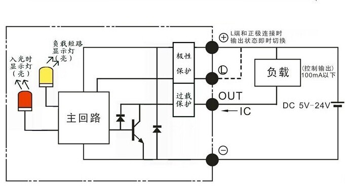 ● “L”引腳與“+”引腳相接時,輸出狀態(tài)即時轉(zhuǎn)換如:受光時指示燈不亮、“out”無輸出電流,相接后指示燈不亮、但“out”有輸出電流。其它各引腳接線錯誤時,傳感器不工作,但傳感器本身不會損壞。